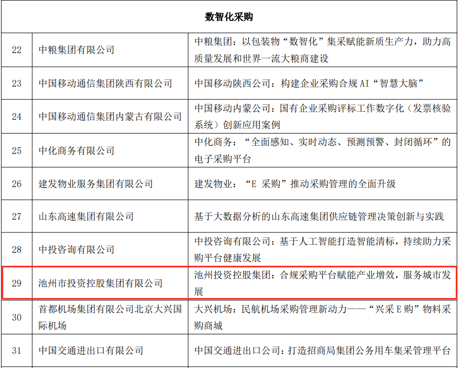近日,中國(guó)物流與采購聯(lián)合會(huì)公共采購分會(huì)面向國(guó)企采購領(lǐng)域征集優(yōu)秀案例活動(dòng)公布了評(píng)審結(jié)果,池州市投資控股集團(tuán)有限公司合規(guī)采購平臺(tái)以“合規(guī)采購平臺(tái)賦能產(chǎn)業(yè)增效,服務(wù)城市發(fā)展”為題,獲評(píng)2024年度全國(guó)公共采購數(shù)智化采購優(yōu)秀案例。