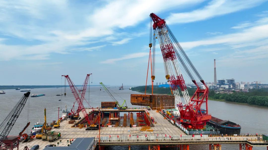 9月4日18時,在距離池州岸約400米的長江江面施工現(xiàn)場,隨著一艘1000噸級吊船平穩(wěn)地將底節(jié)最后一吊鋼圍堰準(zhǔn)確下放到位,標(biāo)志著中鐵大橋局承建的集團“頭號工程”池州長江公鐵大橋南主塔墩(4號墩)大橋南主墩建設(shè)率先轉(zhuǎn)入圍堰施工階段。