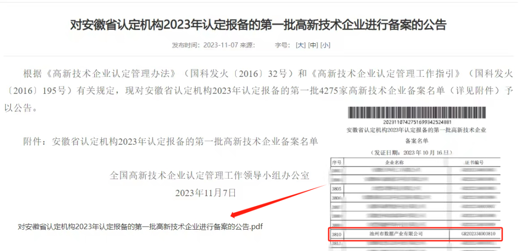 11月7日,全國高新技術(shù)企業(yè)認定管理工作領(lǐng)導(dǎo)小組辦公室發(fā)布《對安徽省認定機構(gòu)2023年認定報備的第一批高新技術(shù)企業(yè)進行備案的公告》,池州市數(shù)據(jù)產(chǎn)業(yè)有限公司名列其中,榮獲2023年度第一批認定的高新技術(shù)企業(yè)。