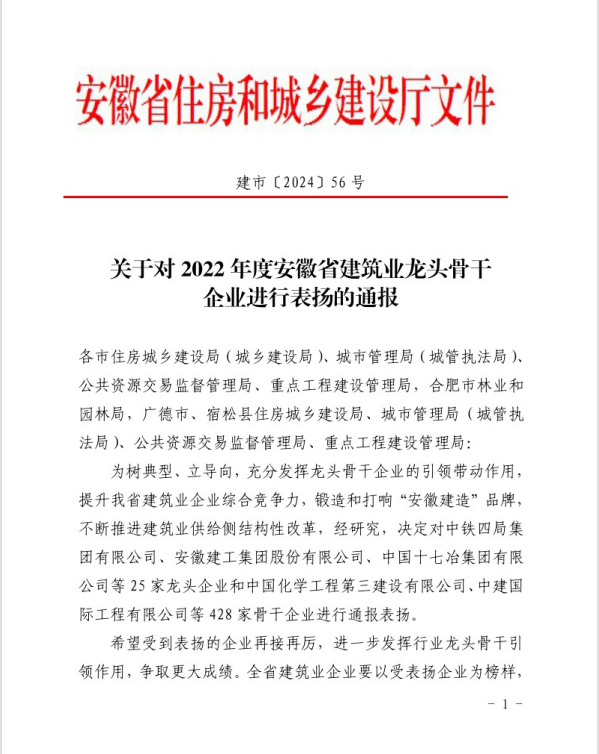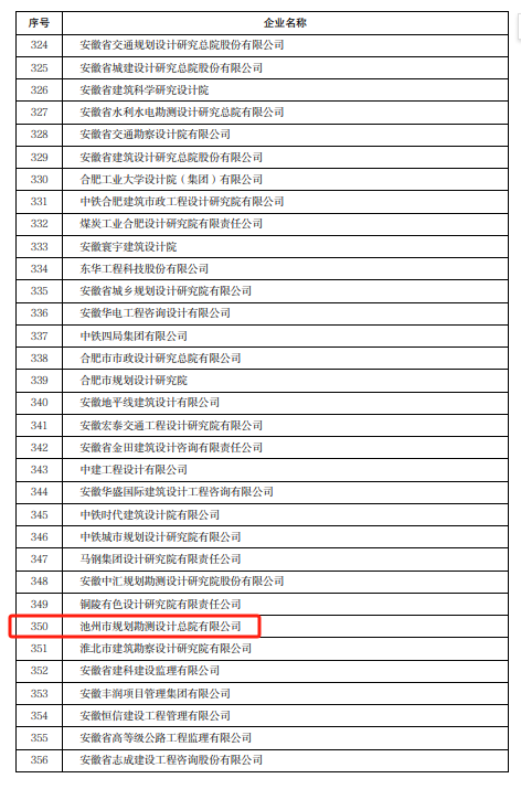 4月10日,安徽省住房和城鄉(xiāng)建設(shè)廳發(fā)布了《關(guān)于對2022年度安徽省建筑業(yè)龍頭骨干企業(yè)進(jìn)行表揚的通報》,集團(tuán)所屬池州市規(guī)劃勘測設(shè)計總院有限公司榮登榜單。